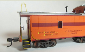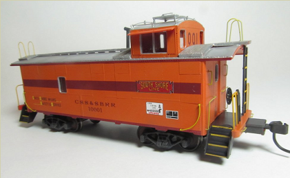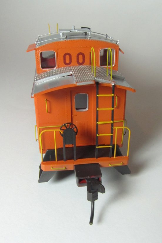 Starting with a Centralia Car Shops CE1 / CE2 Santa Fe waycar model, the car is disassembled and factory paint removed. Prototype-specific details such as antenna stand, antenna, and scratch-built jeweled marker lights are added. The car is then repainted to match either the early or late version, which differs primarily in the end platform and grab iron colors. Following painting, the caboose is lettered with custom-printed decals generated from fonts and artwork created from prototype photos.