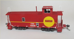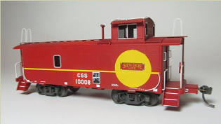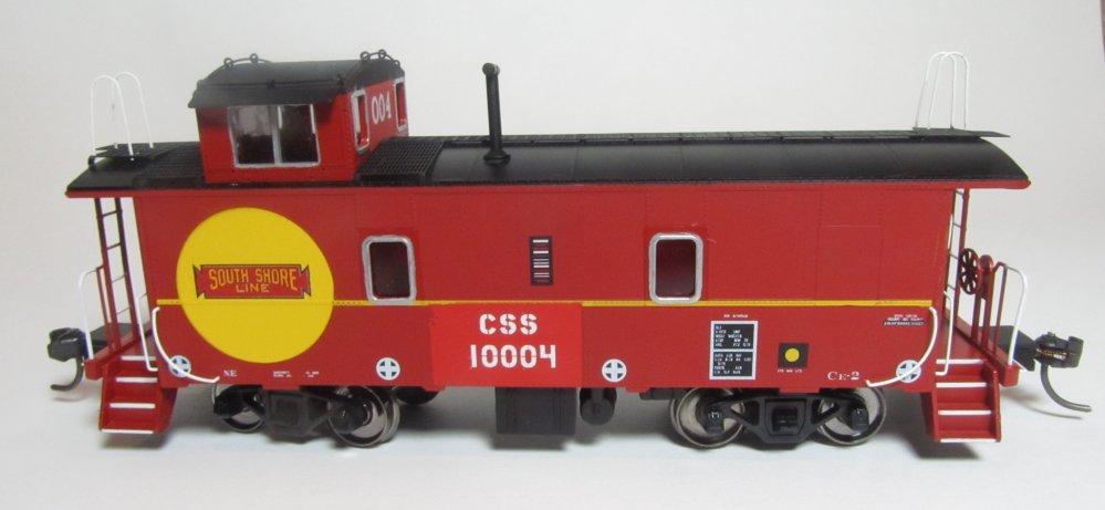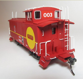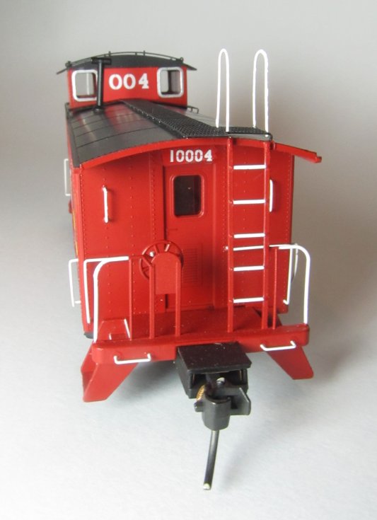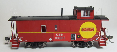 Starting with a Centralia Car Shops CE1 / CE2 Santa Fe waycar model, Santa Fe markings and numbers are masked and overpainted. Prototype-specific details such as scratch-built jeweled marker lights are added. The model is then lettered with custom printed decals from artwork and fonts generated to match prototype photos. Details such as window frames are hand painted.