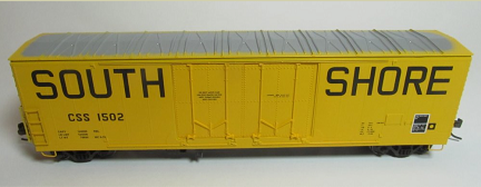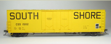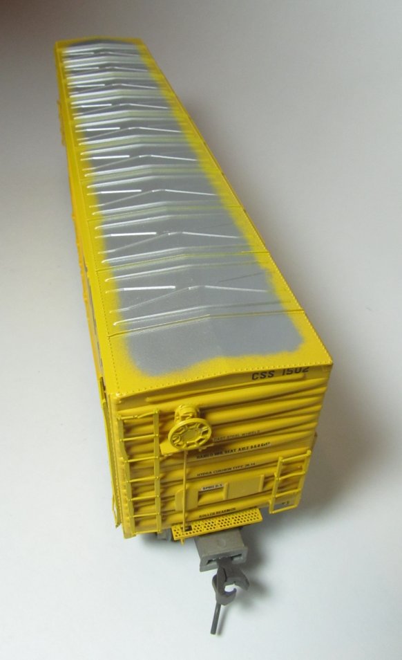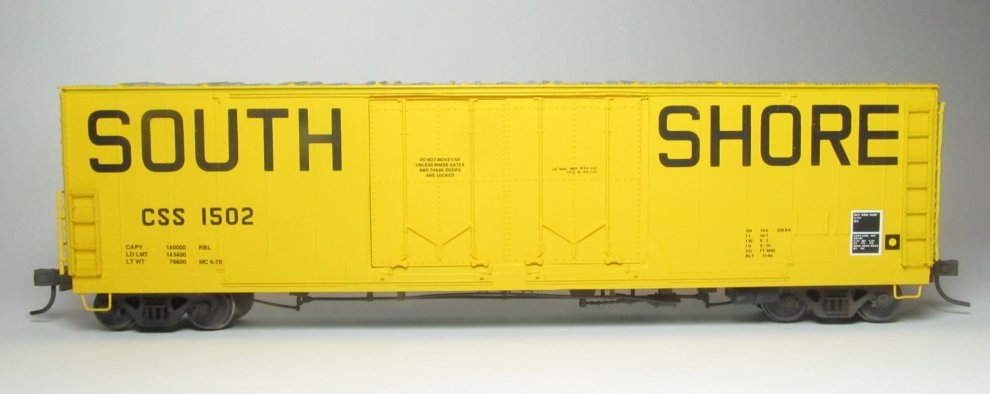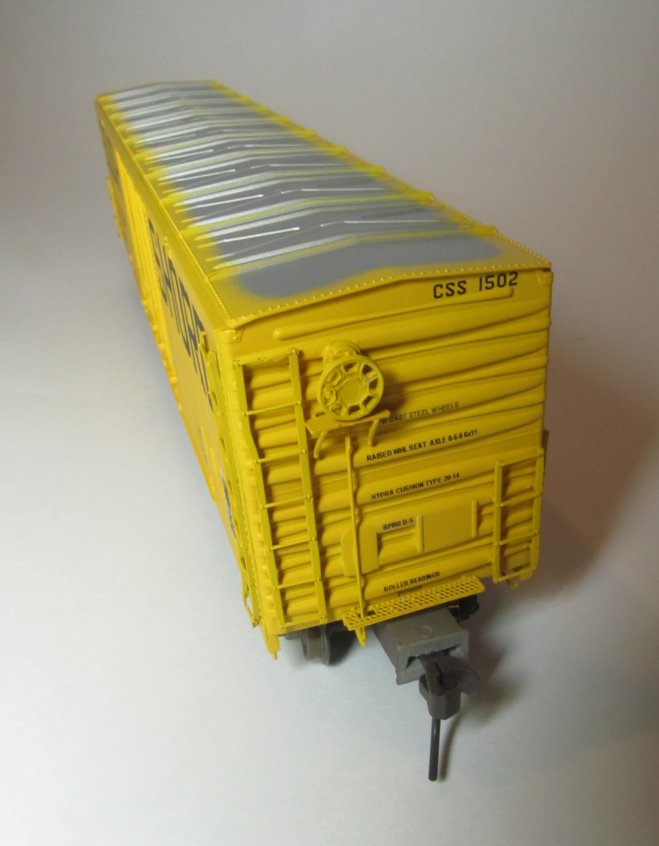 Starting with an Atlas 53' Evans double-door boxcar, the original plug doors are cut out and other details such as stirrups and brake-wheel housing are removed. The car is fitted with prototypically-correct plug doors from Accurail. A new brake wheel housing, brake wheel, and rigging are relocated high on the car end, and tall ladders are added to the brake wheel end. Plano Model Products etched metal coupler platforms are added to each end.