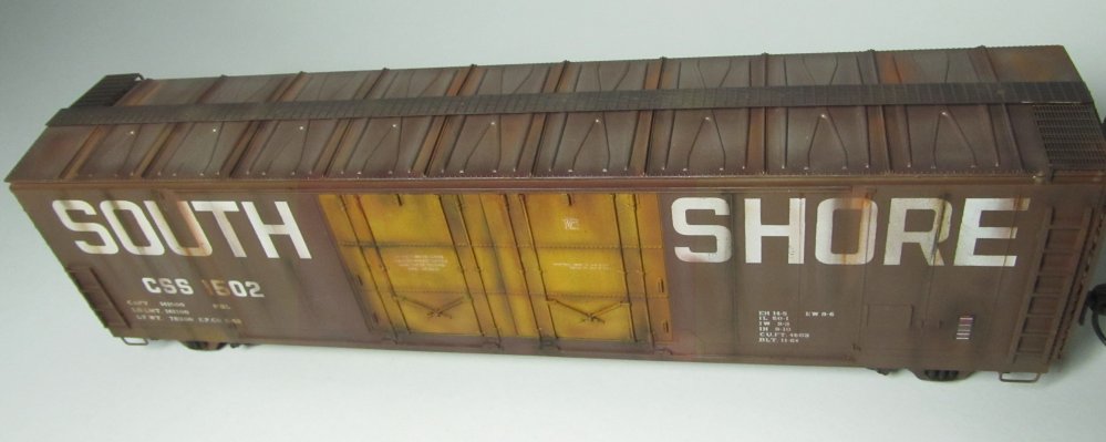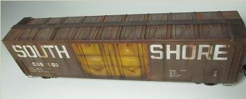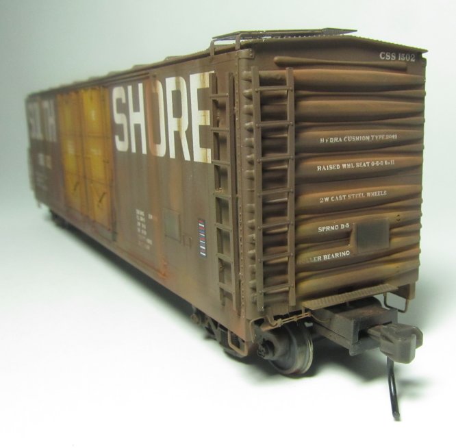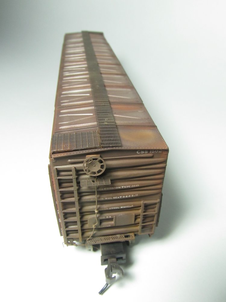 The car is then painted using Tru-Color paints and lettered using custom-made decals created to match the prototype. Weathering is done using airbrush, oils, and powders.