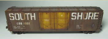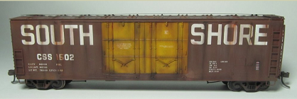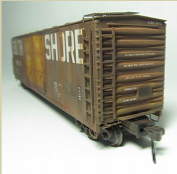 Starting with an Details West or Atlas 53' Evans double-door boxcar, the original plug doors are cut out and other details such as stirrups and brake-wheel housing are removed. The car is fitted with prototypically-correct plug doors from Accurail. A new brake wheel housing, brake wheel, and rigging are relocated high on the car end, and tall ladders are added to the brake wheel end. Plano Model Products etched metal roofwalks and coupler platforms are added.